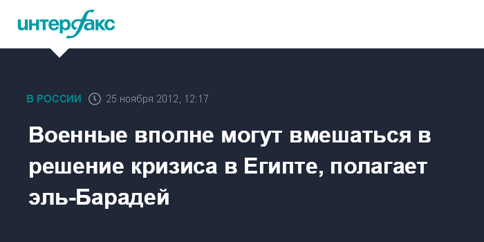 Каир. 25 ноября. INTERFAX.RU - Решение президента Египта Мухаммеда Мурси расширить собственные полномочия и последовавшие за этим акции протеста могут подтолкнуть военных ко вмешательству в ситуацию, заявил бывший гендиректор МАГАТЭ Мухаммед эль-Барадей.