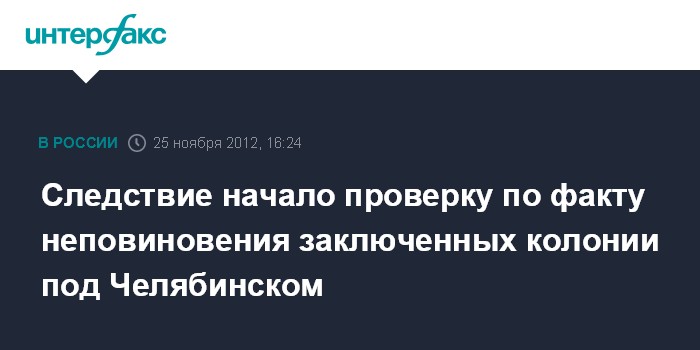 Москва. 25 ноября. INTERFAX.RU - Проводится доследственная проверка в связи с неповиновением заключенных в исправительной колонии №6 в Челябинской области, сообщает в воскресенье сайт Следственного комитета России.