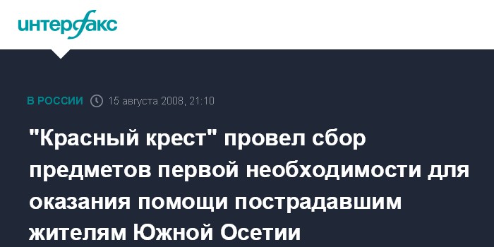 Москва. 15 августа. INTERFAX.RU - В связи с вооруженным конфликтом и большим количеством пострадавших от военных действий грузинских войск Московский Красный Крест (МКК) провел сбор предметов первой необходимости для оказания помощи пострадавшим жителям Южной Осетии, находящимся в зоне военного конфликта, а также прибывшим в Северную Осетию и близлежащие регионы РФ. В распространенном пресс-релизе говорится, что МКК провел сбор предметов первой необходимости, в том числе многоместных палаток, раскладушек, спальных мешков, новой одежды и обуви, предметов гигиены и ухода, постельного белья.