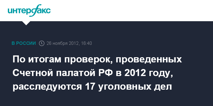 По итогам проверок, проведенных Счетной палатой РФ в 2012 году, расследуются 17 уголовных дел