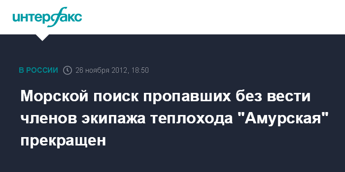 Москва. 26 ноября. INTERFAX.RU - Морской спасательный подцентр (МСПЦ) Южно-Сахалинск 26 ноября принял решение о прекращении морского поиска пропавших без вести членов экипажа теплохода "Амурская", говорится в сообщении Росморречфлота. "В ходе поисково-спасательной операции район гибели теплохода и прилегающих к нему водных поверхностей, побережья островов и материка обследованы качественно и в полной мере", - говорится в сообщении. Поэтому в связи с "отсутствием какой-либо разумной надежды" на обнаружение выживших членов экипажа морской поиск прекращен.