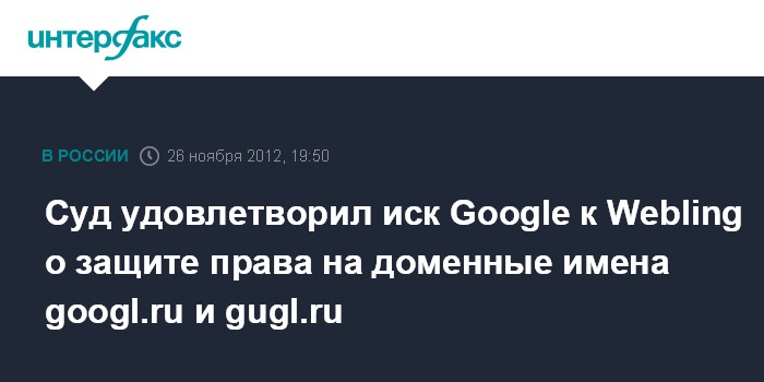 Москва. 26 ноября. INTERFAX.RU - Арбитражный суд Москвы в понедельник удовлетворил иск интернет-гиганта Google Inc. к Weblink Ltd. о защите исключительного права на доменные имена googl.ru и gugl.ru.