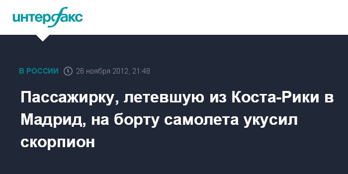 Мадрид. 26 ноября. INTERFAX.RU - Пассажирка испанской авиакомпании "Иберия", летевшая рейсом из Коста-Рики в Мадрид, прямо на борту самолета подверглась нападению скорпиона, сообщило в понедельник агентство EFE.
