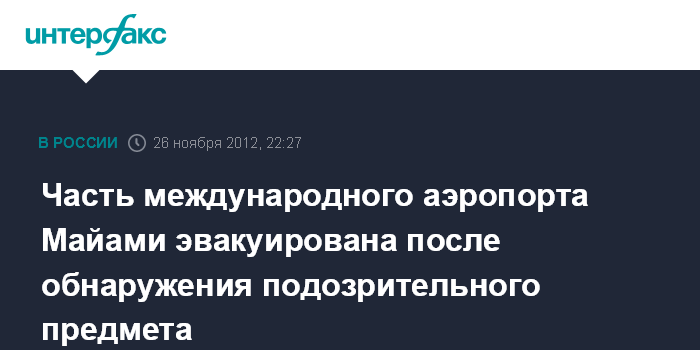 Вашингтон. 26 ноября. INTERFAX.RU - Руководство международного аэропорта Майами в понедельник распорядилось эвакуировать людей из части аэропорта и приостановить работу после обнаружения подозрительного предмета, сообщил в понедельник американский телеканал NBC со ссылкой на пресс-службу аэропорта.