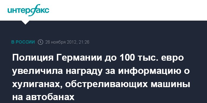 Берлин. 26 ноября. ИНТЕРФАКС - Германская уголовная полиция на специальной пресс-конференции в понедельник объявила о том, что вчетверо - до 100 тыс. евро - увеличила вознаграждение за информацию о таинственном стрелке или стрелках, которые обстреливают автомобили на германских автобанах в основном на севере и западе Германии.