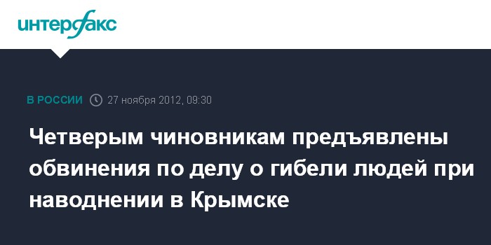 Москва. 27 ноября. INTERFAX.RU - Следствие предъявило обвинение в окончательной редакции четверым чиновникам, по халатности которых погибли люди во время наводнения в Крымске, сообщил официальный представитель СК РФ Владимир Маркин.