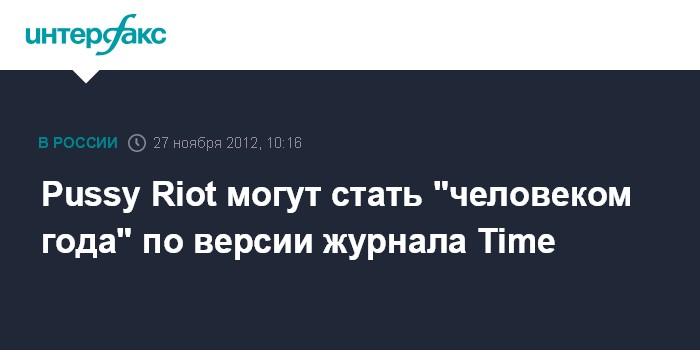 Москва. 27 ноября. INTERFAX.RU – Осужденные девушки из панк-группы Pussy Riot могут стать "человеком года" по версии американского журнала Time. На сайте журнала началось голосование: любой читатель может проголосовать за того или иного претендента на звание "человека года". Между тем, в списке кандидатов не только личности, но и группы людей, как, например, Pussy Riot, Undocumented Immigrants (мигранты без документов); кроме того "человеком года" может стать и марсоход Curiosity, и даже бозон Хиггса.