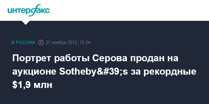 Лондон. 27 ноября. INTERFAX.RU - Картина Валентина Серова "Портрет Прасковьи Мамонтовой" была продана в понедельник в рамках аукциона русского искусства на торгах Sotheby's в Лондоне за 1,2 млн фунтов стерлингов (почти $1,9 млн), что стало ценовым рекордом для работ живописца, передает BBC.