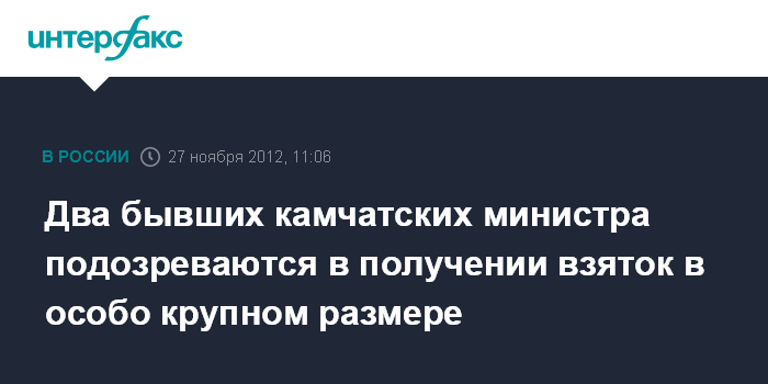 Оба экс-чиновника подозреваются в получении взятки в особо крупном размере, сообщила агентству "Интерфакс - Дальний Восток" во вторник старший помощник руководителя следственного управления СКР по Камчатскому краю Елена Матафонова.