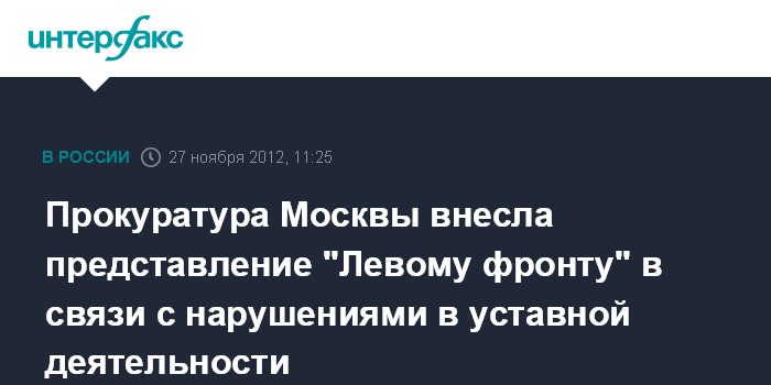 Москва. 27 ноября. INTERFAX.RU - Прокуратура Москвы требует от оппозиционного движения "Левый фронт" устранить выявленные нарушения в уставной деятельности.