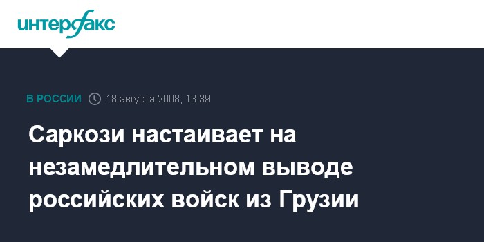 "Этот вывод должен выполняться без промедления, - заявил президент Франции Николя Саркози в статье, которая в понедельник опубликована во французской газете "Фигаро". - Это должно касаться всех российских войск, которые вошли в Грузию после 7 августа. Если эта часть соглашения о прекращении огня не будет приниматься быстро и всеобъемлюще, я созову чрезвычайное заседание Европейского Совета на уровне глав государств, на которое будет вынесен вопрос о последствиях".