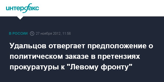 Москва. 27 ноября. INTERFAX.RU - Координатор оппозиционного движения "Левый фронт" Сергей Удальцов удовлетворен итогами проверки движения столичной прокуратурой. "С удовлетворением отмечаю, что прокуратура не вышла за рамки закона. В ее представлении никакого политического заказа в отношении "Левого фронта" не усматривается", - сказал Удальцов во вторник "Интерфаксу".