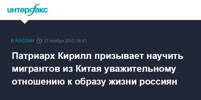 Москва. 27 ноября. INTERFAX.RU - Патриарх Московский и всея Руси Кирилл заявил о необходимости обучения трудовых мигрантов из Китая русскому языку и культуре.
