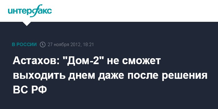 Москва. 27 ноября. INTERFAX.RU - Телепрограмму "Дом-2" не смогут транслировать в дневное время, поскольку это противоречит закону о защите детей от вредной информации, заявил уполномоченный при президенте РФ по правам ребенка Павел Астахов.