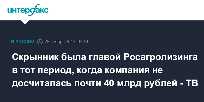 Скрынник была главой Росагролизинга в тот период, когда компания не досчиталась почти 40 млрд рублей - ТВ
