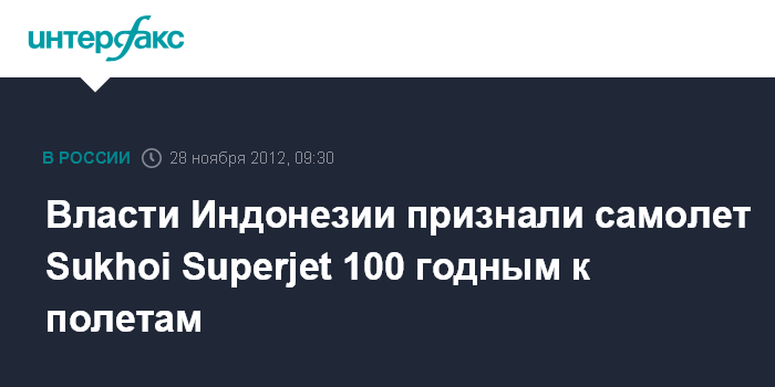 Джакарта. 28 ноября. ИНТЕРФАКС - Министерство транспорта Индонезии объявило о решении признать самолет Sukhoi Superjet 100 годным к полету, несмотря на произошедшую в мае этого года катастрофу.