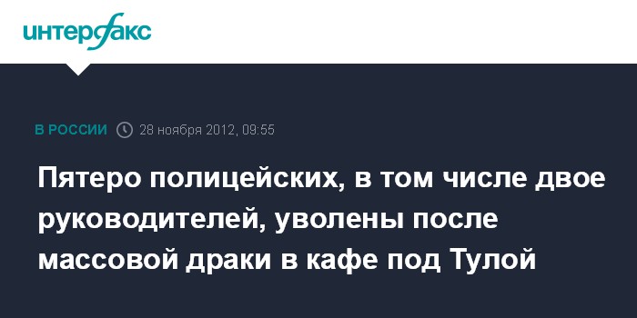 Тула. 28 ноября. INTERFAX.RU - После проведенной служебной проверки уволены трое сотрудников полиции, непосредственно принимавших участие в массовой драке в кафе города Богородицка Тульской области, сообщил "Интерфаксу" в среду руководитель пресс-службы регионального УМВД Андрей Ярцев.
