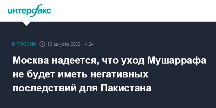 "В России рассчитывают на то, что уход президента Пакистана Мушаррафа в отставку не будет иметь негативных последствий для поддержания внутриполитической стабильности в этой крупной азиатской стране. Рассчитываем, что ситуация в Пакистане не выйдет за пределы конституционного поля, будет оставаться в рамках законности и правопорядка", - заявил официальный представитель МИД РФ Андрей Нестеренко.