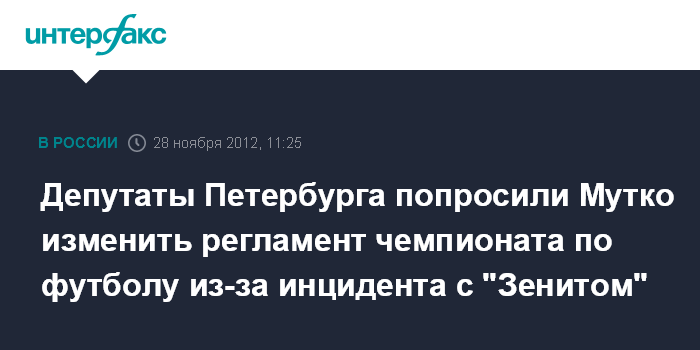 Санкт-Петербург. 28 ноября. INTERFAX.RU - Депутаты Законодательного собрания Санкт-Петербурга обратились к министру спорта РФ Виталию Мутко с просьбой внести изменения в регламент чемпионата России по футболу в связи с инцидентом с "Зенитом", передал корреспондент "Интерфакса" с заседания парламента.
