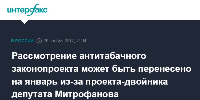 "Мы пытались назначить первое чтение на 21 ноября. Иногда тридцатью днями на согласование проекта с субъектами Федерации разрешают пренебречь. Мы предлагали пойти на это, чтобы успеть принять закон до 1 января 2013 г., но совет Госдумы это не одобрил. Формально он прав", - заявил изданию председатель комитета Госдумы по охране здоровья Сергей Калашников.