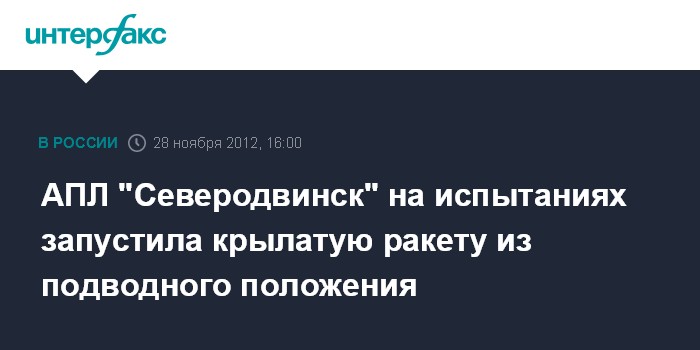 Москва. 28 ноября. INTERFAX.RU - Многоцелевая атомная подводная лодка проекта 885 (шифр "Ясень") "Северодвинск" выполнила стрельбу из подводного положения сверхзвуковой крылатой ракетой по наземной цели в ходе испытаний в акватории Белого моря, сообщил "Интерфаксу-АВН" в среду источник в оборонно-промышленном комплексе.