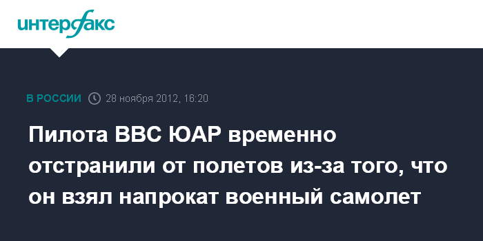 Йоханнесбург. 28 ноября. INTERFAX.RU - Руководство ВВС ЮАР временно отстранило от полетов пилота за то, что он "взял напрокат" военный самолет, чтобы навестить своего друга, проживающего в соседней Ботсване, говорится в среду в заявлении министерства обороны ЮАР.