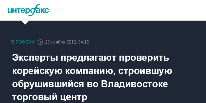 Владивосток. 29 ноября. ИНТЕРФАКС-ДАЛЬНИЙ ВОСТОК - Комиссия "Альянса строителей Приморья" (АСП) предлагает проверить работу корейской компании, задействованной на строительстве торгового центра, где произошло обрушение, в результате чего под завалами оказались восемь человек.