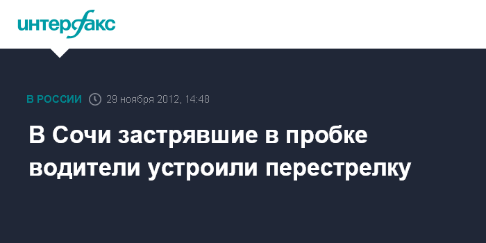 Сочи. 29 ноября. INTERFAX.RU - В Центральном районе Сочи из-за образовавшейся автомобильной пробки водители устроили перестрелку, сообщил агентству "Интерфакс-Юг" источник в правоохранительных органах города.