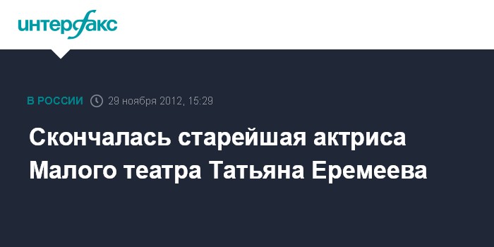 Москва. 29 ноября. INTERFAX.RU - На сотом году жизни умерла старейшая актриса Малого театра Татьяна Еремеева, сообщили в четверг "Интерфаксу" в Малом театре.