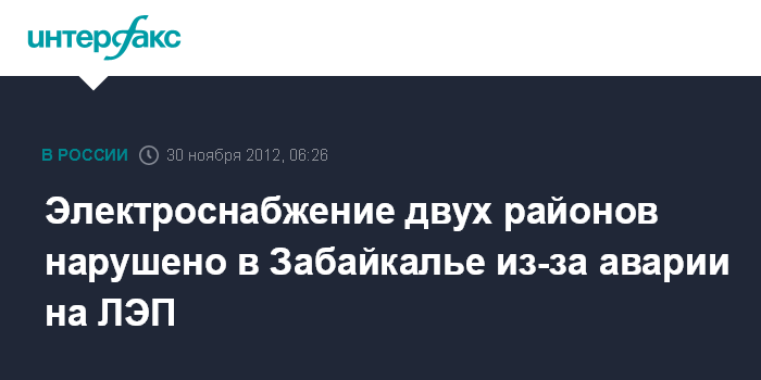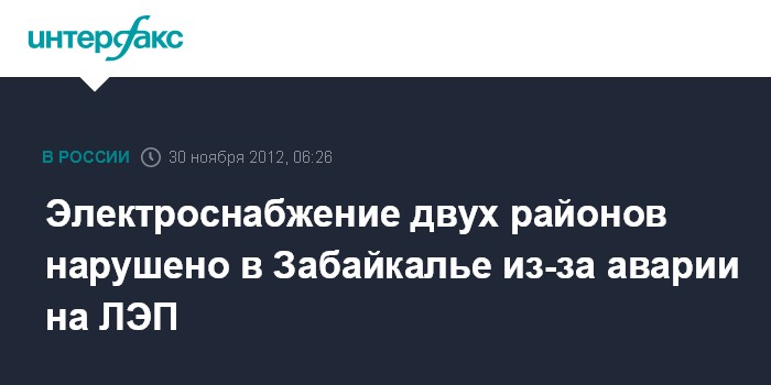 Чита. 30 ноября. ИНТЕРФАКС-СИБИРЬ - В Забайкальском крае из-за аварии на линии электропередач ВЛ 110 кВ "Петровск -Забайкальский" - "Малета" нарушено электроснабжение Красночикойского и частично Петровск-Забайкальского районов, сообщает пресс-служба ОАО "МРСК Сибири"- "Читаэнерго" в пятницу.