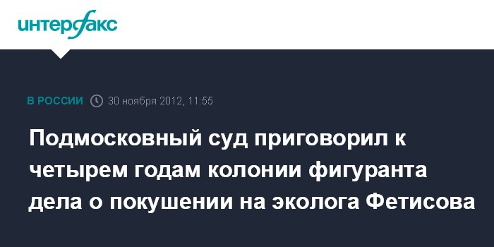 Москва. 30 ноября. INTERFAX.RU - Московский областной суд приговорил к 4 годам лишения свободы Андрея Каширина за пособничество в покушении на убийство химкинского эколога Константина Фетисова.