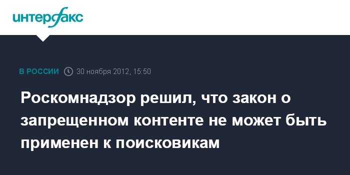 Москва. 30 ноября. INTERFAX.RU - Сайты с запрещенной информацией, отображающиеся в поисковых системах после соответствующих запросов, не могут служить основанием для запрета поисковой системы, сообщают в Роскомнадзоре.
