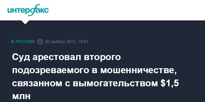 "Тверской районный суд заключил под стражу второго подозреваемого по делу о мошенничестве (ст. 159 УК РФ), связанном с вымогательством 1,5 млн долларов", - сообщает пресс-служба ГУ МВД по Москве в пятницу.