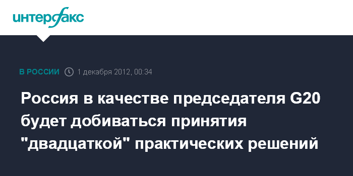 Москва. 1 декабря. ИНТЕРФАКС - В субботу начинается российское председательство в "Группе 20".