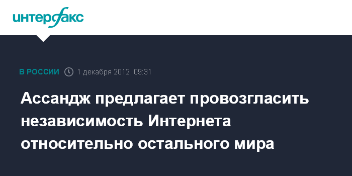 Москва. 1 декабря. INTERFAX.RU - Основатель скандального ресурса WikiLeaks Джулиан Ассандж опасается установления во "всемирной паутине" тотального контроля государств за целыми народами. Он предлагает добиваться независимости Интернета, чтобы "вырвать его из рук деспотичного государства" и, наконец, создать "всемирную цивилизацию".