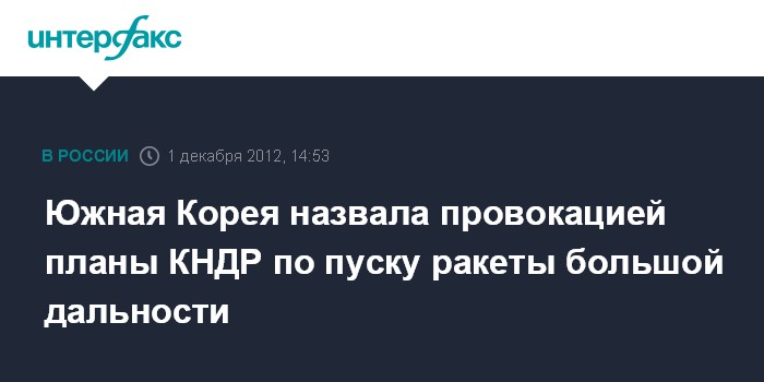 Сеул. 1 декабря. INTERFAX.RU - Южная Корея выразила обеспокоенность по поводу планов КНДР по осуществлению пуска ракеты большой дальности в середине декабря, говорится в распространенном в субботу заявлении южнокорейского МИД. "То, что Северная Корея в очередной раз пытается запустить ракету большой дальности - это серьезная провокация", - говорится в заявлении.
