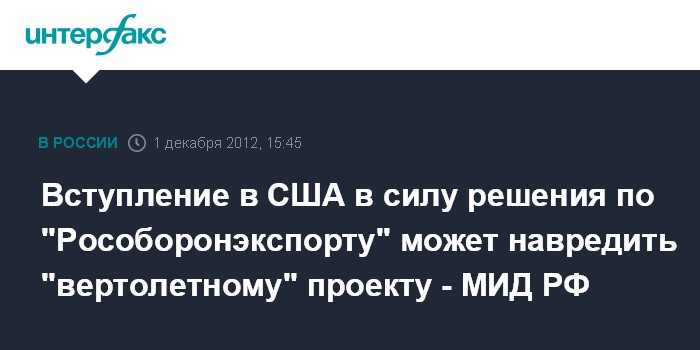 "Сотрудничество с "Рособоронэкспортом" американских структур, которые отвечают, в том числе, за так называемый "вертолетный проект", всегда было очень позитивным, и мы бы не хотели, чтобы этом сотрудничеству был нанесен ущерб в результате непродуманных и фундаментально вредных умонастроений среди части американских сенаторов", - сказал журналистам замглавы МИД РФ Сергей Рябков.