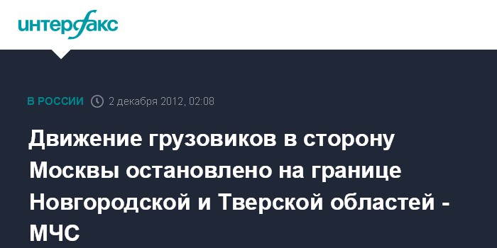 Москва. 2 декабря. ИНТЕРФАКС - Движение большегрузного транспорта в сторону Москвы на автотрассе "Россия" остановлено на границе Новгородской и Тверской областей из-за погодных условий, сообщает сайт ГУ МЧС России по Новгородской области.