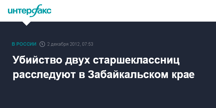 Чита. 2 декабря. ИНТЕРФАКС-СИБИРЬ - Следственные органы Забайкальского края возбудили уголовное дело по факту убийства двух 17-летний девушек, тела которых были обнаружены накануне в бане одного из частных домов в городе Нерчинске, сообщает в воскресенье пресс-служба краевого СУ СКР.