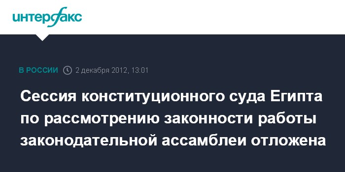 Каир. 2 декабря. INTERFAX.RU - Конституционный суд Египта отложил проведение сессии, на которой планируется рассмотреть законность работы законодательной ассамблеи, разработавшей проект новой конституции Египта, сообщает в воскресенье египетское государственное телевидение.