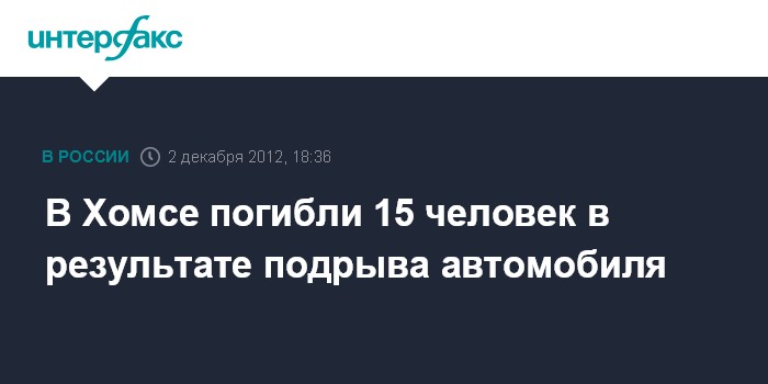 Бейрут. 2 декабря. INTERFAX.RU - Не менее 15 человек погибли в воскресенье в результате подрыва автомобиля, начиненного взрывчаткой в сирийском городе Хомсе, сообщает сирийское государственное телевидение. Еще около 30 человек ранены, состояние некоторых оценивается как критическое. Телевидение назвало произошедшее терактом. Ответственность за подрыв никто пока на себя не взял.