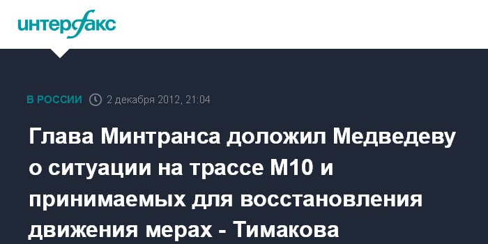 Глава Минтранса доложил Медведеву о ситуации на трассе М10 и принимаемых для восстановления движения мерах - Тимакова