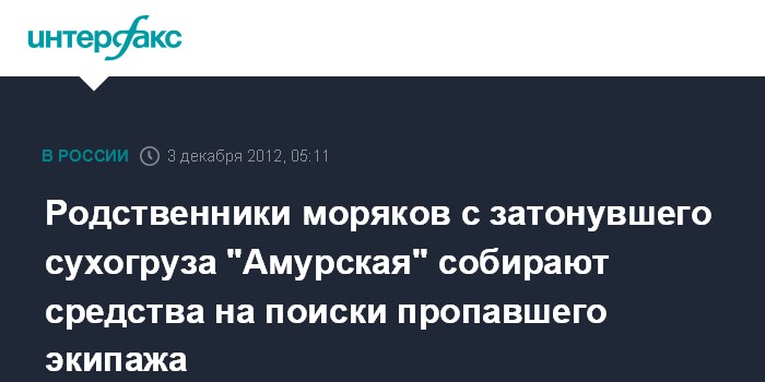 Хабаровск. 3 декабря. ИНТЕРФАКС-ДАЛЬНИЙ ВОСТОК - Родственники членов экипажа сухогруза "Амурская", затонувшего в Охотском море 28 октября, начали сбор средств на оплату дальнейших поисков моряков, судьба которых по-прежнему остается неизвестной.
