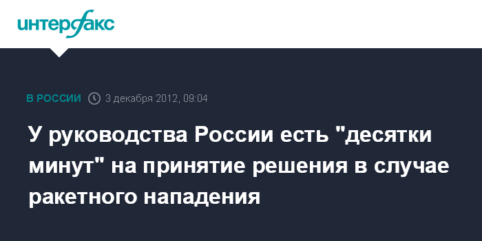 Москва. 3 декабря. INTERFAX.RU - Руководство страны имеет "десятки минут" для того, чтобы принять решение в случае ракетного нападения на Россию, сообщил в эфире радиостанции "Эхо Москвы" исполняющий обязанности начальника командования противовоздушной и противоракетной обороны Войск воздушно-космической обороны (ВВКО) генерал-майор Андрей Демин.
