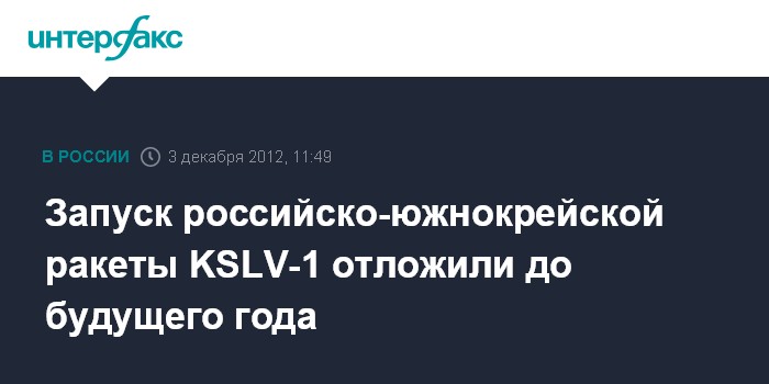 Москва. 3 декабря. INTERFAX.RU - Запуск российско-южнокорейской ракеты-носителя KSLV-1 перенесен, как минимум, на месяц, сообщили в понедельник "Интерфаксу-АВН" в российской ракетно-космической отрасли.