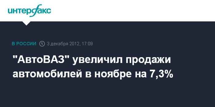 Москва. 3 декабря. INTERFAX.RU - ОАО "АвтоВАЗ" по итогам работы в ноябре 2012 г. увеличило продажи автомобилей с учетом экспорта на 3,2% по сравнению с ноябрем прошлого года - до 50,964 тыс. штук, сообщила компания.