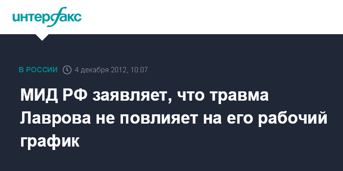 Москва. 4 декабря. INTERFAX.RU - Незначительная травма, полученная главой МИД РФ Сергеем Лавровым, не окажет влияния на его рабочий график, сообщили "Интерфаксу" во вторник в департаменте информации и печати МИД РФ.