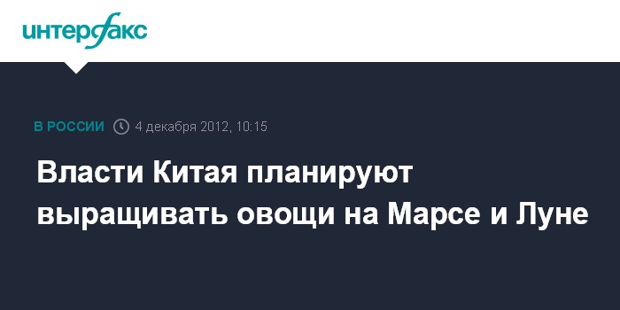 Пекин. 4 декабря. INTERFAX.RU- Руководство Китая готовится к выращиванию четырех видов овощей на Марсе и Луне для создания там "экологической системы поддержания жизни" для космонавтов, сообщают во вторник местные СМИ со ссылкой на Центр исследований и подготовки китайских космонавтов в Пекине.