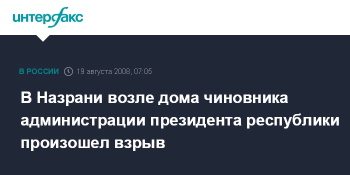 Москва. 19 августа. ИНТЕРФАКС - Неустановленное взрывное устройство сработало в ночь на вторник в Назрани возле дома, где проживает начальник управления по работе с обращениями граждан администрации президента Ингушетии, сообщили "Интерфаксу" в штабе временной группировки войск.