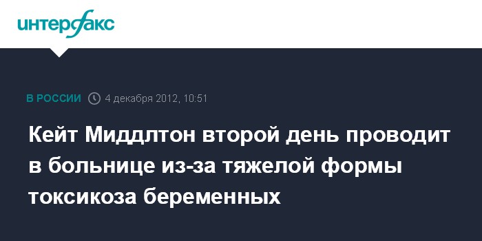 Лондон. 4 декабря. INTERFAX.RU - Герцогиня Кембриджская Кейт Миддлтон вынуждена некоторое время провести в одной из лондонских больниц в связи с сильно выраженными симптомами токсикоза беременных, сообщает во вторник BBC.